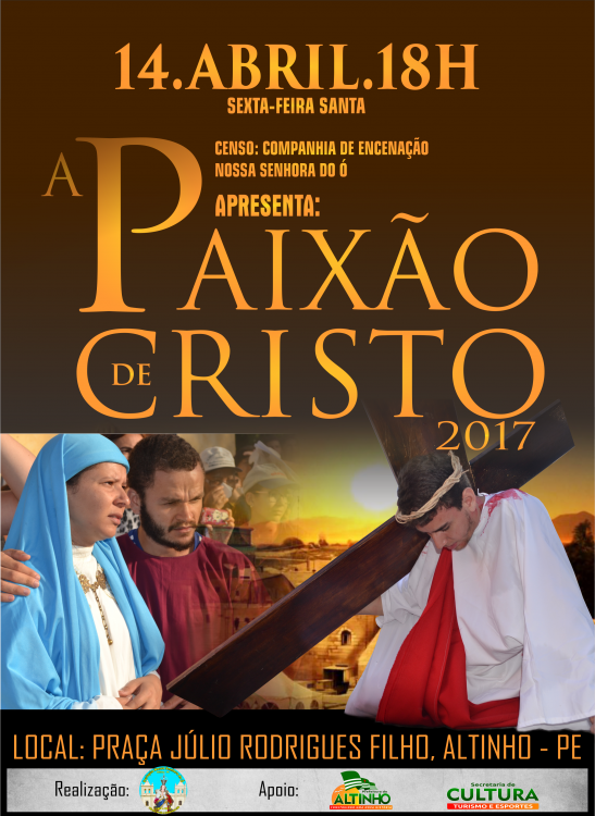 Paixão de Cristo será apresentada em Altinho pelo Grupo de Teatro CENSO (Companhia de Encenação Nossa Senhora do Ó). O evento acontecerá dia 14 de abril às 18h, na praça Júlio Rodrigues Filho. (Por: