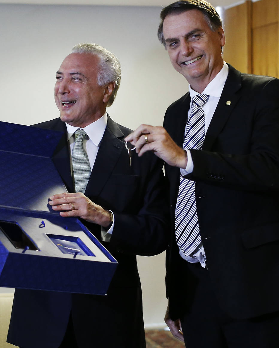Ao visitar o Palácio do Planalto pela primeira vez desde que foi eleito presidente, Jair Bolsonaro também recebeu das mãos do presidente Michel Temer as chaves do sistema E-Governa, um banco de dados com as informações oficiais de todas as áreas do governo, separadas por ministério.